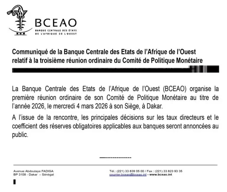 La Banque Centrale des Etats de l’Afrique de l’Ouest (BCEAO) tiendra, le mercredi 4 mars 2026 à Dakar, la première session ordinaire de l’année de son Comité de Politique Monétaire (CPM).