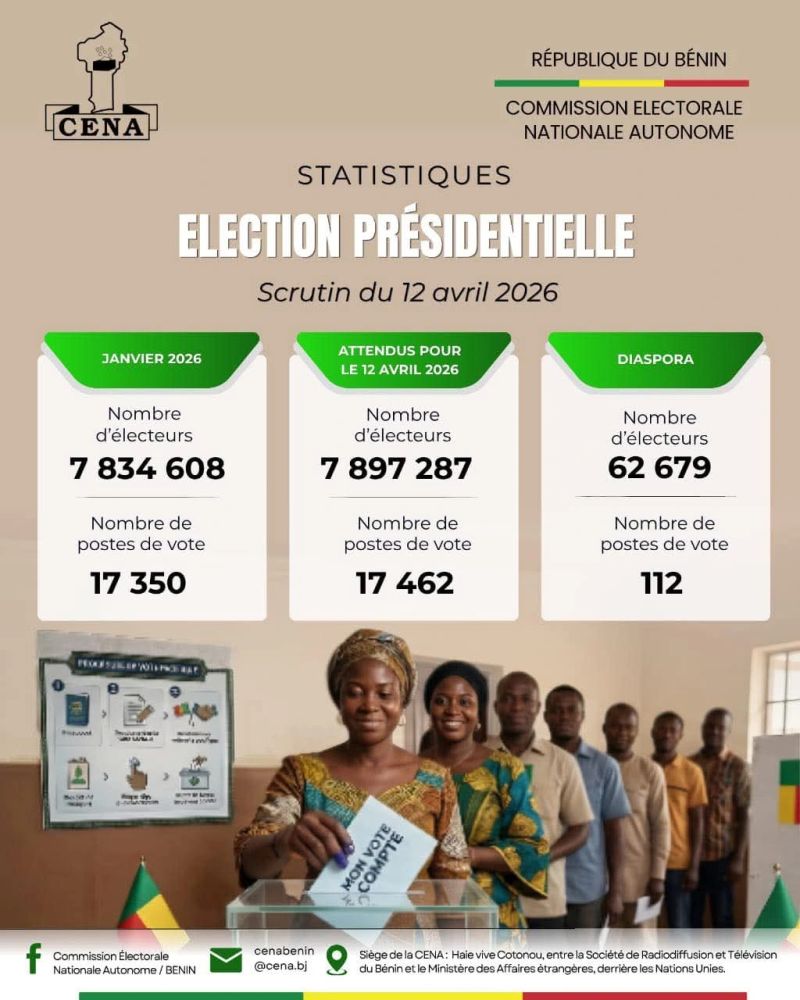 La Commission électorale nationale autonome (Cena) a publié les statistiques officielles relatives au corps électoral en vue de l’élection présidentielle prévue le 12 avril 2026. Ces données traduisent une progression du nombre d’inscrits et une mobilisation accrue de l’appareil électoral sur l’ensemble du territoire.