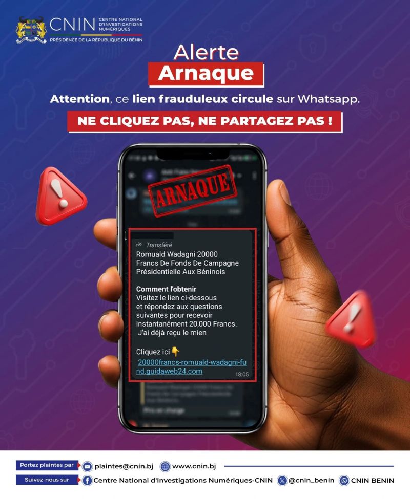 Le Centre national d’investigations numériques (CNIN) a lancé une alerte face à la circulation d’un lien frauduleux sur la messagerie WhatsApp, promettant des gains financiers fictifs aux internautes. Le message incriminé évoque notamment : « Romuald Wadagni 20 000 francs de fonds de campagne présidentielle aux Béninois ».