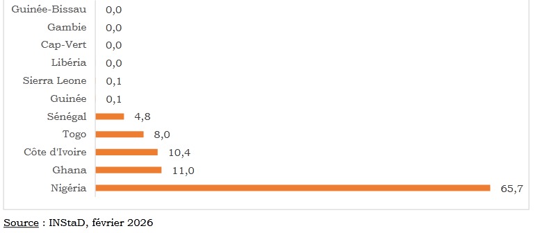 Selon le Bulletin trimestriel du commerce extérieur, publié par l’INStaD le 11 Février 2026, les échanges du Bénin avec ses partenaires de la Communauté Economique des États de l’Afrique de l’Ouest (CEDEAO) ont connu un léger repli au quatrième trimestre 2025. Les importations en provenance de l’espace communautaire s’établissent à 54,4 milliards de FCFA, en baisse de 2,3 % par rapport au trimestre précédent. Dans ce paysage sous-régional, le Nigéria s’impose comme le premier fournisseur du Bénin. Le géant voisin domine largement les flux commerciaux, porté essentiellement par les exportations d’ « huiles de pétrole ou de minéraux bitumineux », évaluées à 27,5 milliards de FCFA. À ces produits énergétiques s’ajoutent les « ciments hydrauliques » (1,1 milliard de FCFA), les « boissons non alcooliques » (0,7 milliard) ainsi que les « autres houilles, même pulvérisées » (0,6 milliard).