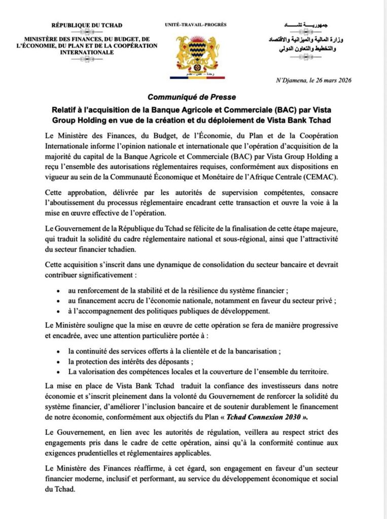 Le Ministère des Finances, du Budget, de l’Économie, du Plan et de la Coopération Internationale du Tchad a annoncé, dans un communiqué en date du 26 mars 2026, la finalisation de l’acquisition de la majorité du capital de la Banque Agricole et Commerciale par Vista Group Holding du burkinabè Simon Tiemtoré. Cette opération, qui a reçu l’ensemble des autorisations réglementaires requises au sein de la Communauté économique et monétaire de l’Afrique centrale, ouvre la voie à la création et au déploiement de Vista Bank Tchad.